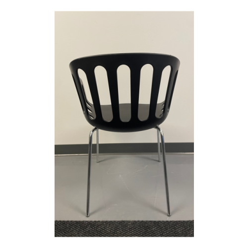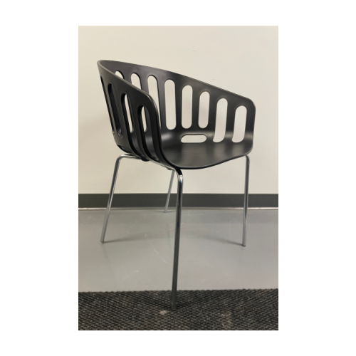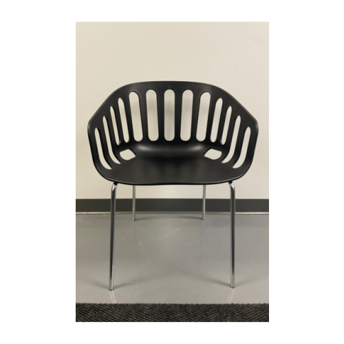 Chair with a molded plastic shell featuring decorative cut-outs, integrated arms, and four metal legs—simple, modern, and versatile for various spaces.