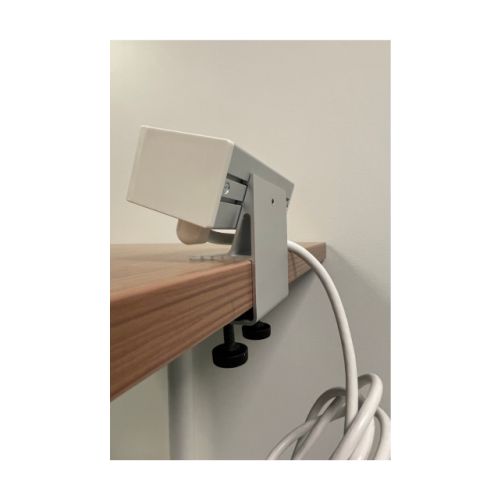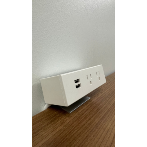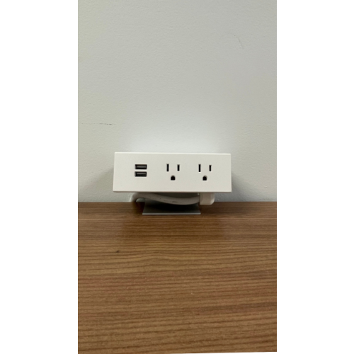 Compact power module with a worksurface clamp, featuring 2 electrical receptacles and 2 USB-A port—ideal for easy, accessible power at any workstation.